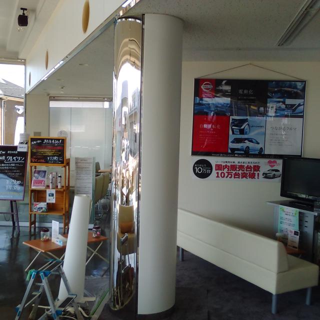 海老名 綾瀬 座間 厚木 ダイノック 今回のお仕事は HPはコチラ ⇒ 日産神奈川 綾瀬小園店 店舗改装のお手伝い 円柱に、リアテックを貼りを依頼され 位置決めをしっかりして、皺を逃がすように 大変ですけど、一人で貼っていきます。